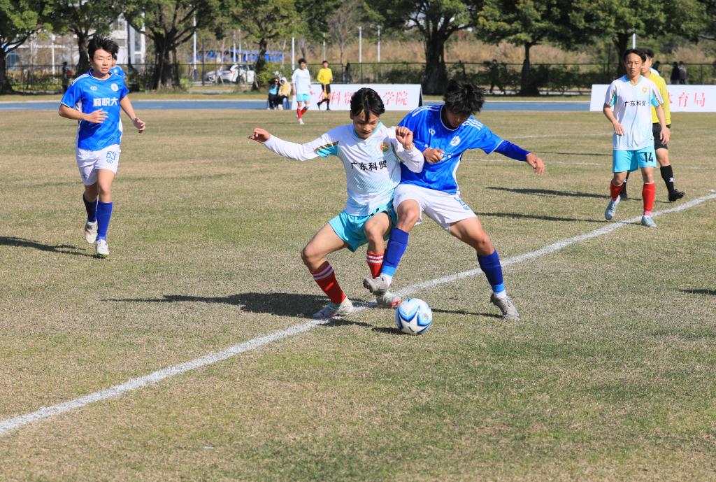 1月6日,我校男子足球队前往广东科贸职业学院,开始首回合客场征战。在凛冽的寒风中,我校队员顶住压力、奋勇拼搏,与对手展开激烈角逐,最终以2:2的比分战平对手,获得争夺季军的主动权。1月8日,第二回合比赛在我校举行,我校队员士气高昂、配合默契、攻防有序,牢牢掌控赛场节奏,在场边200多名师生的呐喊助威声中,以3:1的比分完胜对手。