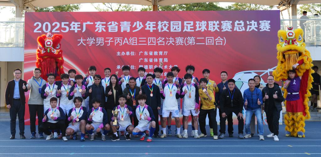 1月8日,2025年广东省青少年校园足球联赛大学男子丙A组三、四名决赛(第二回合)在我校举行,我校男子足球队主场3:1战胜广东科贸职业学院队。凭借此前第一回合比赛客场2:2逼平对手,最终我校男足以5:3的总分斩获联赛季军。广东省教育厅体育卫生与艺术教育处负责人,学校党委委员、副校长杨小东出席闭幕式并为球队颁奖。